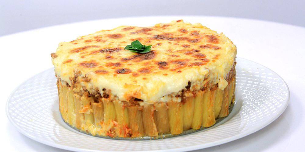 - 5 يُسكب مزيج اللحم المجهز فوق المعكرونة في الطبق نفسه ثم تُسكب فوقه الكمية المتبقية من مزيج المعكرونة.