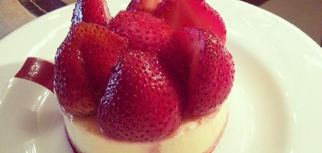 - نضع الإناء في الثلّاجة لمدّة ساعتين كاملتين، ومن ثمّ نخرجه ونضع قطع الفراولة على الوجه للتزيين، ومن ثمّ نعيده إلى الثلّاجة لمدّة نصف ساعة، وبعدها نخرجه ويصبح جاهزاً للتقديم.