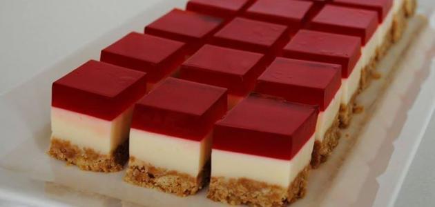 - ثمّ نخرج الصينية من الثلاجة ونسكب عليها طبقة الجلي بالتساوي (الطبقة الرابعة)، ونتركها حتّى تبرد ثمّ ندخلها إلى الثلاجة لمدة ساعة على الأقل حتّى تتماسك الطبقات مع بعضها البعض.