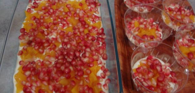 - نسكب الخليط السابق في وعاء ونضيف له الرمّان ونقلب، ثم نسكب المهلبية في أطباق التقديم.