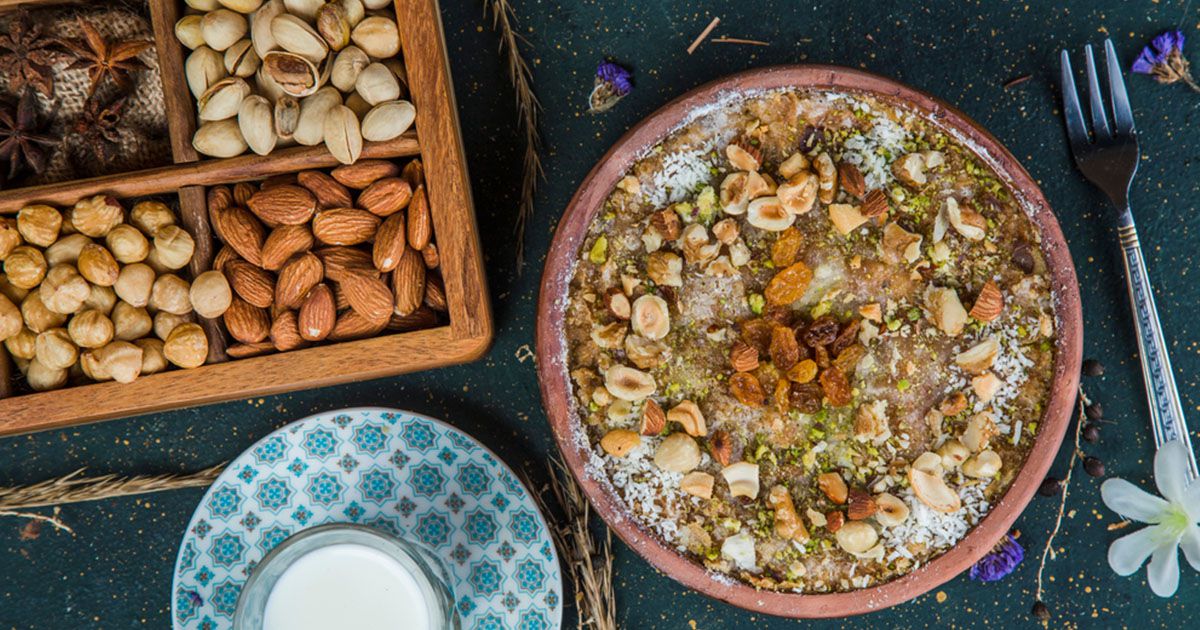 8- أخرجي الطاجن من الفرن وزيّني بالفستق الحلبي، الزبيب، الجوز، اللوز، البندق وجوز الهند. ألف صحة!