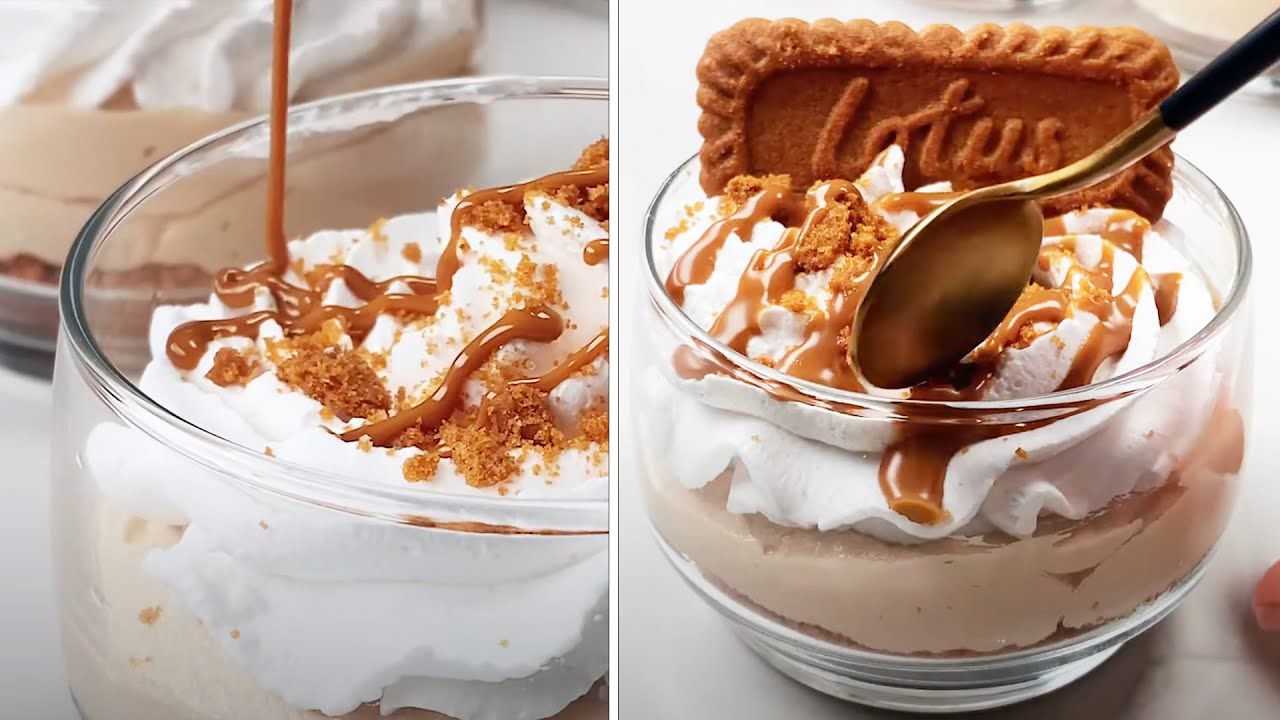 8- أضيفي القليل من البسكويت المفتت ثمّ وزعي القليل من زيدة اللوتس وضعي حبة بسكويت في كل كاسة.