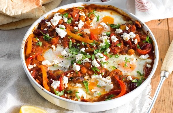 - قدمي طبق الشكشوكة دافئة مع خبز الييتا المحمص.