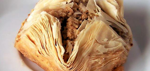 - نعيد وضع الكمية المتبقية من مزيج الحشوة على العجينة، ونعيد وضع باقي شرائح العجينة، ونرتبها فوق بعضها البعض، مع مراعاة دهن كل شريحة بالزبدة.