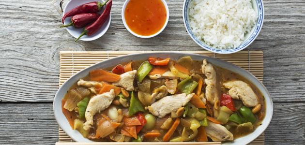 • وضع حلقات البذنجان بين قطع الدجاج.
