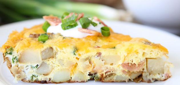 - ثم نحضر البيضات الثلاث ونفقسهم في وعاء عميق ثم نخفقهم جيداً حتى يتجانس الصفار مع البياض ولا ننسى أن نضع رشة من الملح والفلفل الأسود إلى البيض أثناء خفقه، وبعدها نسكب البيض في المقلاة فوق البطاطا والبصل ونستمرّ بالتحريك دون توقف إلى أن ينضج البيض جيداً ويقدم هذا الطبق ساخن مع السلطة العربيّة والخبز الطازج.