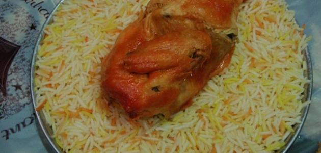 - ندهن الدجاج بماء الزعفران، ثمّ نرشّ الزيت النباتي على قطع الدجاج وندخلها إلى الفرن حتى يتحمّر الوجه.