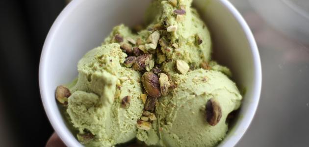 - إخراج الآيس كريم من المجمد وأخذ مقدار منه بشكل كرات ووضعها في كاسات تقديم الآيس كريم وتزيينها بإضافة المزيد من البستاشيو.