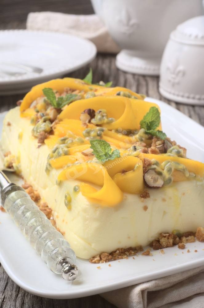 4. وبإستخدام خلاط كهربائي يخفق خليط الكريمة لمدة 15 دقيقة أو حتى يتكاثف قليلاً يم تضاف المانجو و تصب في الصينية المعدة و تغطي بالبلاستيكية المتراكم خارج الجوانب و توضع في الفريزر لمدة ليلة أو حتى تتماسك  .