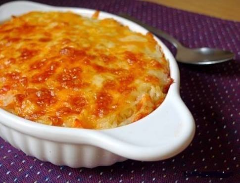 - لا تتركي اﻷرز حتي يجف تمامًا بل بمجرد التسوية ضيفي 3 ملاعق بشاميل إليه و قلبيهم جيدًا .