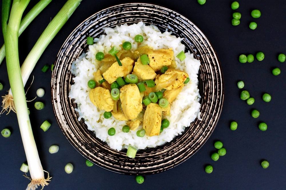- يوضع الأرز في الطبق، ويوضع فوقها مقدار من الدجاج بالكاري.
