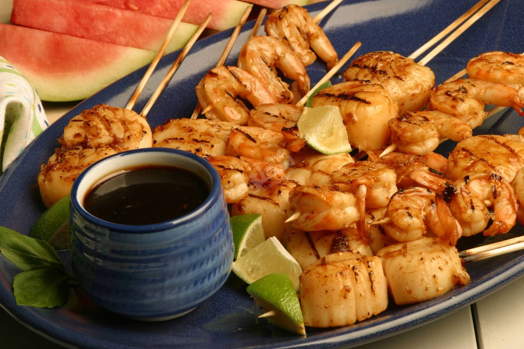 - يرص الجمبري في الأسياخ الخشبية، ويوضع على الشواية، ويرش عليه زيت الزيتون، ويقلب على الجانبين حتى ينضج.