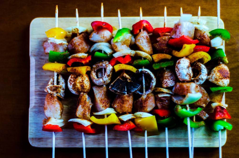 - نرص قطع اللحم في الأسياخ الخشبية بالتبادل مع قطع الفلفل الاخضر والاحمر والبصل مع ترك مسافة 2 سم في نهاية السيخ “حتى لا تخرج من الأسياخ أثناء التسوية”.