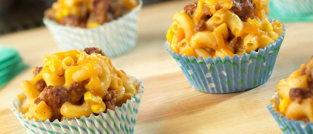 - قسمي مزيج المكرونة و اللحم على قوالب المافن ثم وزعي باقي كمية الجبن على المافن.