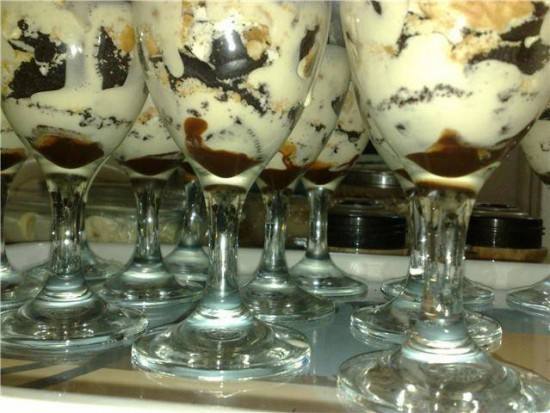 - بالكاسات صبي فيها قليل من الكاكاو ثم نصف ملعقة من الخلطة بعد ذلك أثنين من الأوريو المكسر.