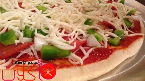 ١٢-تخرج من الفرن وتدهن بالصلصة ثم ربع كاس جبنة وتوضع عليها الخضروات (البصل والفطر وفليفلة الخضراء والبيبروني).