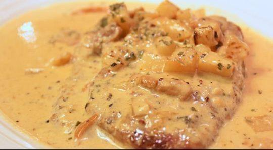 - انتهي بتقديم شرائح اللحم مع خليط المكرونة وانثري قليل من صوص الكريمة على السطح.