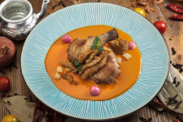 افخاذ دجاج مشوية بالفرن محضرة بطريقة مميزة مع مجموعة من التوابل و المكونات الطازجة ذات النكهات القوية مثل ورق الغار و اوراق الكاري بالاضافة الى باقة عطرية من التوابل الهندية الفاخرة .