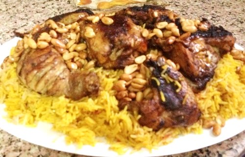 - ننتظر عشر دقائق ثم نطفئ النار وننتظر عشر دقائق أخرى ونكشف الأرز ونسكبه ونضع الدجاج على الوجه ونزينه باللوز المقلي والبقدونس المفروم ..