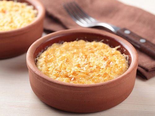٦-ثم في الفخار الذي سوف يوضع في الفرن ثمندهن بالقليل من الزبدة ونسكب الرز واللبن و نضيف باقي القشطة و ملعقة سمن على الوجه.