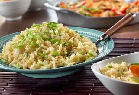 - ضعي الأرز في اطباق التقديم ثم ضعي علية الجوز هند و البصل الأخضر.