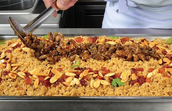 14. ويقدم الأرز في طبق تقديم ووضع الكبد والقوانص فوقها، مع رش كمية مناسبة من المكسرات المفضلة إليك.