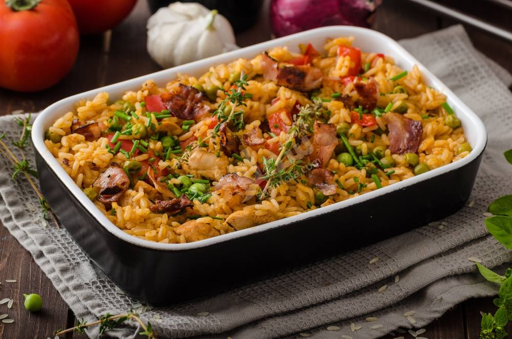 - ضعي قطع الدجاج مرة اخرى على خليط البصل ثم اضيفي الطماطم و الأرز و الملح و الأوريجانو و الفلفل الأسود و ورقة اللورى.