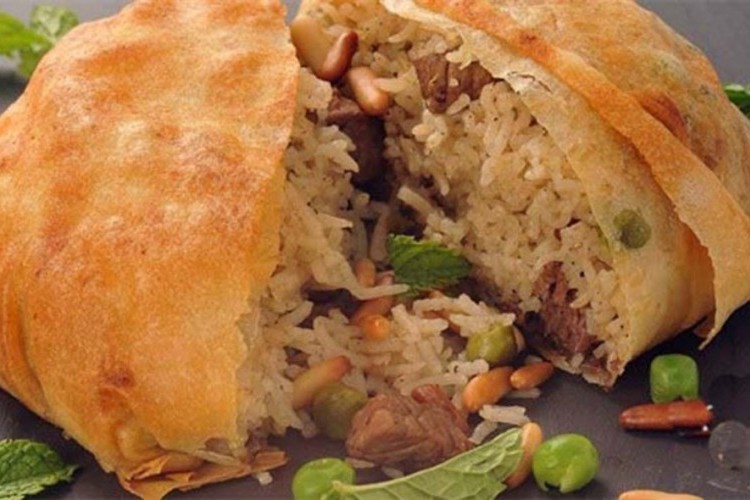 9. نأخذ وعاء آخر أصغر من الوعاء السابق ونملؤه بمزيج الأرز، ثم نقلبه فوق وعاء رقائق العجين لينفصل الأرز ويصبح فوق العجين بعد أن يأخذ شكل الوعاء الصغير.