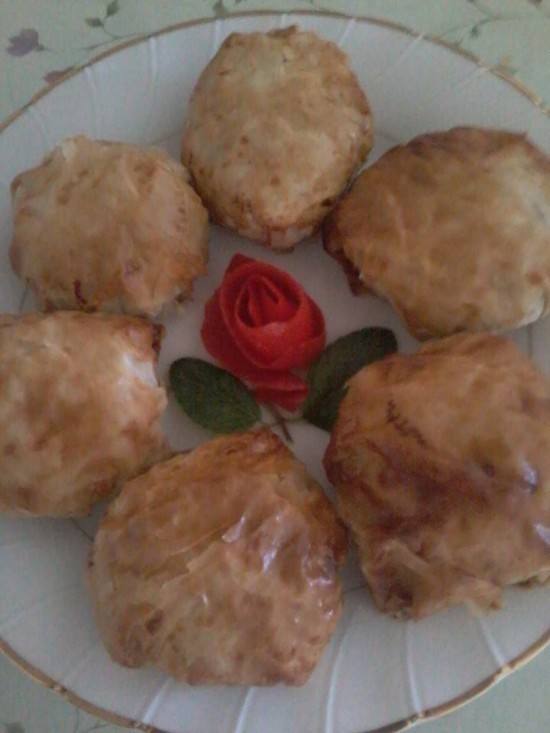 - ونبدأ بحشو الجلاش ، نأخد 1 ورقه جلاش ونقسمها نصفين ونطبقهم ونضع الحشوه ونغلقها علي شكل دائره ونضغط عليها بشكل خفيف حتى تنتهى كمية الجلاش .