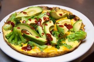 - ضعي الأفوكادو و الكاتشب على الأومليت و قدمية.