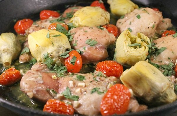 - أعيدي الدجاج إلى القدر الهولندي، اضيفي الأرضي شوكي والطماطم الكرزية وعصير الليمون والزعتر.