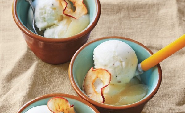 - اسكبي الآيس كريم في أوعية صغيرة وضعي فوقه ملعقة من صوص التفاح وزينيه بشرائح التفاح، وقدميه مباشرة.