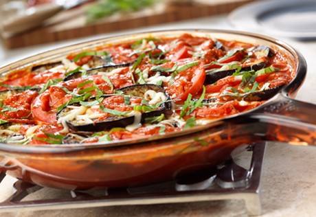 - ضعي باقي كمية الصوص في المقلاة ثم ضعي باقي كمية الباذنجان و الطماطم و الجبن في المقلاة على الصوص.
