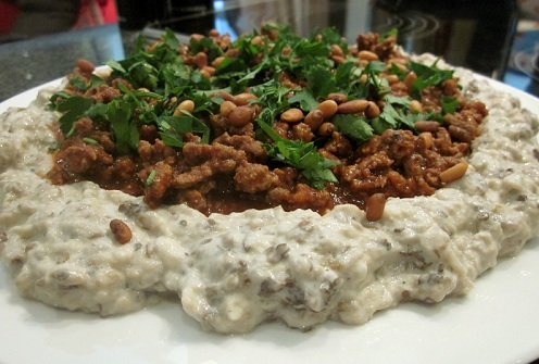 12. – نضع خليط الباذنجان والبدوة في طبق ونضع فوقه اللحمة المتبلة مع رب البندورة ونرش فوقها البقدونس والجوز المجروش ويصبح طبق الباطرش جاهز للتقديم