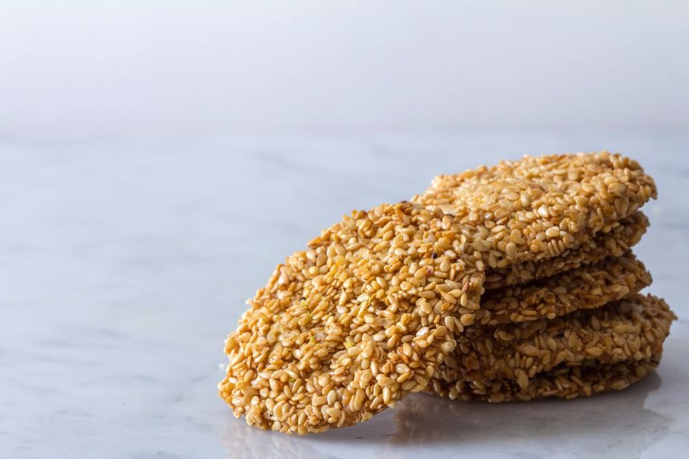 - يغمس وجه الكرة في الفستق، والوجه الآخر في السمسم، مع الضغط براحة اليد ليتماسك وتصبح دائرية رقيقة.