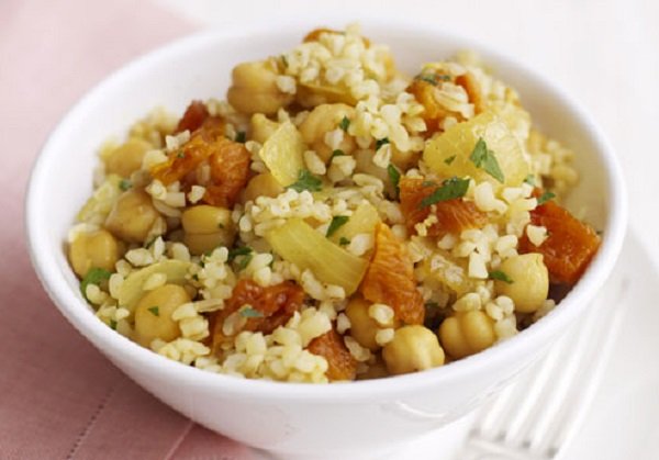 - أضيفي حبات الحمّص، المشمش، الملح ونصف كوب المتبقي من مرقة الخضار، سخني الخليط ليغلي وابعدي المقلاة عن النار، وحركيه مع البرغل والبقدونس.
