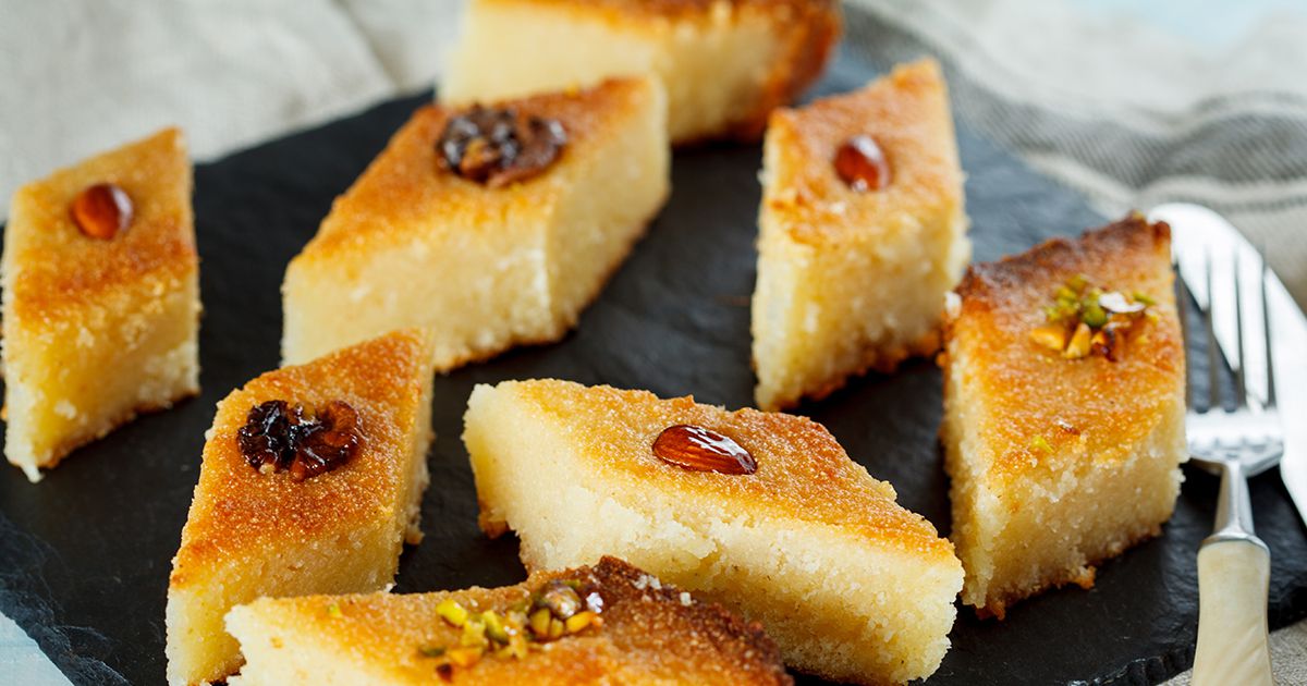 6- ارفعي الصينية من الفرن وأضيفي القطر الساخن إلى البسبوسة. أتركيها حتى تبرد وتتشرب القطر. اتبعي هذه النصائح لتحضير بسبوسة طرية. 7- قطعي البسبوسة وقدميها على سفرتك.