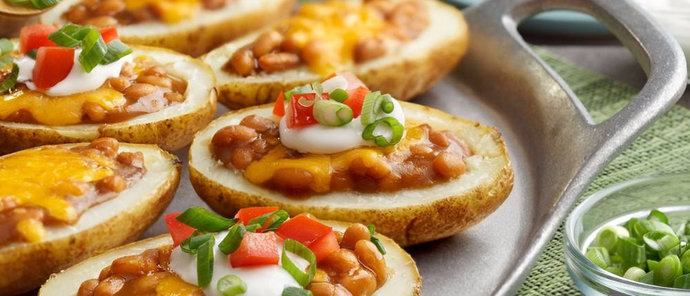 - قومي بتقسيم الفاصوليا على البطاطس ثم ضعي 1 ملعقة كبيرة من الجبن فوق كل نصف من ثمرة البطاطس.