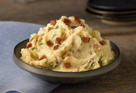 - ضعي البطاطس المهروسة في طبق التقديم ثم ضعي عليها باقي كمية البيكون