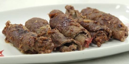 - تبلى قطع البفتيك ثم إحشيه بالبسطرمة و لفيه على شكل رول ثم لفيه بالخيط.