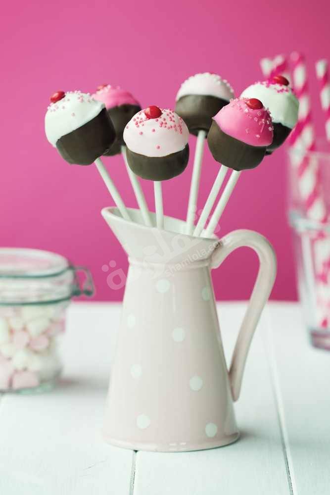 - غمسي نصف كمية كرات البوب كيك في وعاء الشوكولاتة البيضاء والنصف الآخر فى وعاء الشوكولاتة المخلوطة باللون الزهرى .
