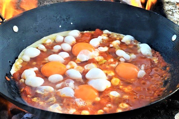 6. نوزع البيضات الأربعة على شكل عيون فوق الطماطم و نتركها لتنضج