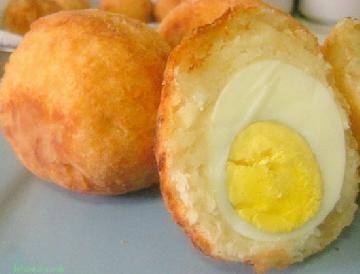 - تغلف كل بيضة منفردة بالدقيق ثم خليط الدجاج ثم تدهن بالبيض المخفوق و توضع ي البقسماط.