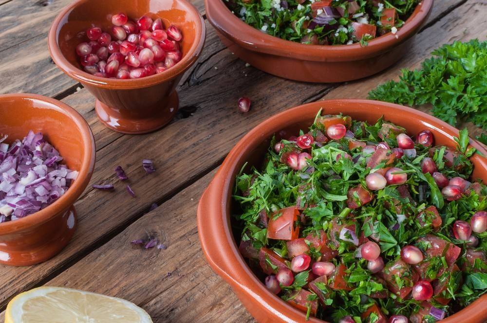 - توضع الطماطم في بولة، ويضاف إليه البصل والبقدونس والكزبرة والنعناع والرمان، وتخلط جيداً.