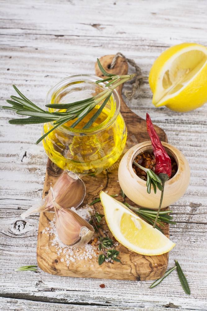 - ضعي الزيت والليمون والثوم والبقدونس والكزبرة والبابريكا والكمون والفلفل الحار والكزبرة والكركم في طبق عميق .