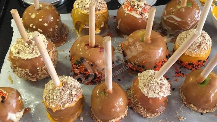 - ضعي ثمر التفاح في الكراميل حتى يغطية بالكامل ثم ضعية على ورق الزبدة في الصينية.