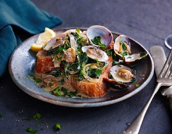 التوست بالسبانخ و المحار ، يمتص التوست عصارة المحار الكريمي والسبانخ ونكهة الليمون لوجبة غداء أو عشاء شهية و خفيفة وسهلة التحضير .