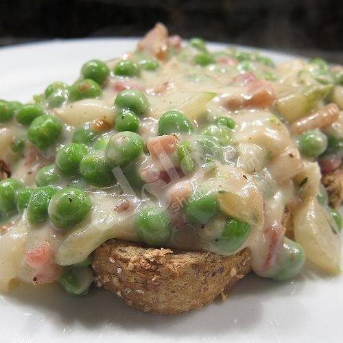 - ضعي كريمة المشروم على خليط البسلة ثم اضيفي اللبن حتى يصبح الخليط سميك القوام.