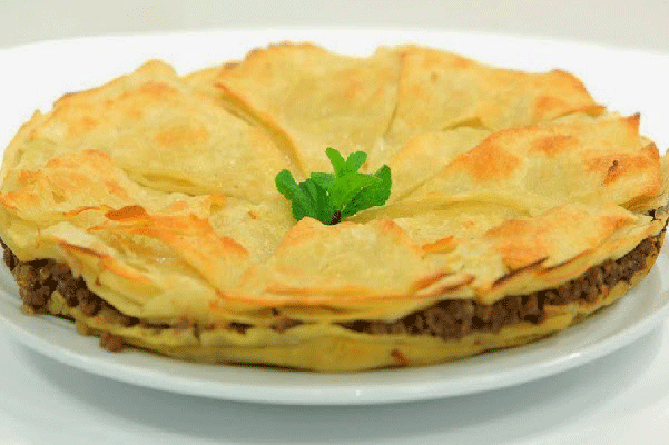 - 6 يُوزع جزء من خليط اللحم، ثم يتم عمل طبقة أخرى من 5 ورقات جلاش، كما بالسابق.