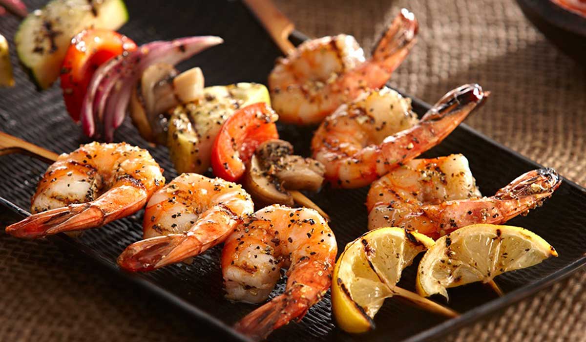 - 1 نضع صلصة المحار في وعاء وزيت السمسم وزيت الزيتون وعصير الليمون وقشر الليمون والزنجبيل. نقلب ونضيف الفلفل الأسود والملح. نضيف حبات الجمبري ونغطيها بالمزيج جيدا. نغلق الوعاء ونضعه في الثلاجة ساعتين. نضع حبات الجمبري في أسياخ ونشويها على الفحم مع التقليب حتى تمام النضج.